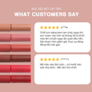 Son kem lì nhung mịn 3CE Velvet Lip Tint là lựa chọn hoàn hảo cho những ai muốn sở hữu đôi môi mềm mịn, mỏng nhẹ nhưng vẫn đầy sắc màu. Với thiết kế sang trọng, bảng màu đa dạng và chất son đỉnh cao, đây chính là thỏi son “must-have” trong bộ sưu tập trang điểm của mọi cô gái. Son phù hợp dùng hằng ngày, đi học, đi làm hay dự tiệc đều tôn lên vẻ đẹp tự nhiên và hiện đại. Tham khảo tại mịphamcom